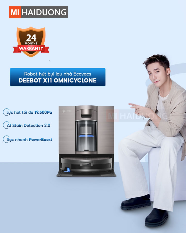 Robot hút bụi lau nhà Ecovacs Deebot X11 OmniCyclone – sức mạnh làm sạch vượt trội kết hợp cùng trí tuệ nhân tạo tiên tiến. Điểm đặc biệt cùa model mới này nằm ở trạm sạc OmniCyclone độc quyền với công nghệ PureCyclone 2.0, cho phép robot tự động thu gom bụi bẩn vào khoang chứa không túi, mang đến trải nghiệm rảnh tay trọn vẹn. Sở hữu công nghệ PowerBoost cùng con lăn OZMO ROLLER 2.0 thế hệ mới, thiết bị dễ dàng xử lý mọi loại bề mặt, kể cả các mép tường và góc khuất nhờ TrueEdge 3.0. Tất cả tạo nên một giải pháp làm sạch toàn diện, mạnh mẽ và tiện lợi hơn bao giờ hết.