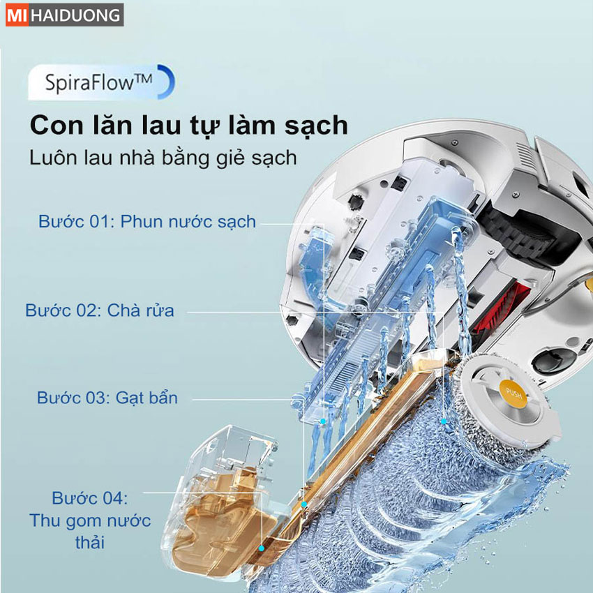 Robot hút bụi lau nhà Roborock Qrevo Curv 2 Flow được trang bị công nghệ SpiraFlow™ với quy trình làm sạch bốn bước khép kín, giúp khăn lau luôn sạch mới trong từng lần vận hành: