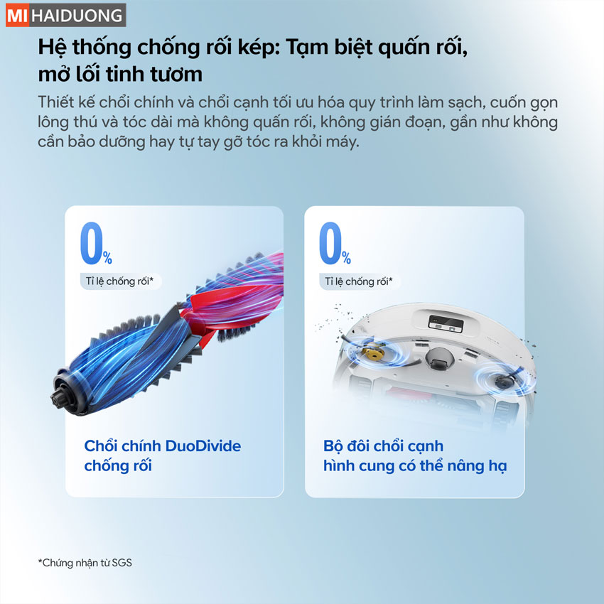 Công nghệ này đã được kiểm chứng bởi SGS và TÜV Rheinland (Đức) với chứng nhận 0% tỉ lệ rối tóc, đảm bảo trải nghiệm vệ sinh mượt mà, không gián đoạn. Với khả năng hút tóc và lông tối ưu, robot Qrevo Curv 2 Flow giúp bạn duy trì không gian sạch sẽ, thoáng mát, để thú cưng thoải mái vận động mà không gây phiền toái trong việc dọn dẹp.