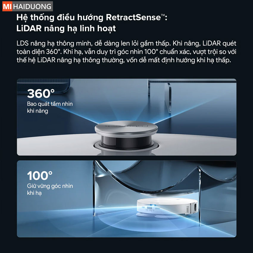 Thiết kế siêu mỏng 7.98cm: Trang bị hệ thống điều hướng LDS tự nâng hạ (RetractSense), dễ dàng đi sâu vào các khu vực gầm thấp.
