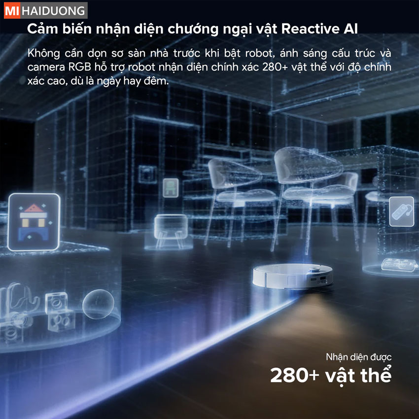Nhận diện vật cản Reactive AI: Khả năng nhận diện chính xác hơn 280 loại đồ vật phổ biến trên sàn nhà.