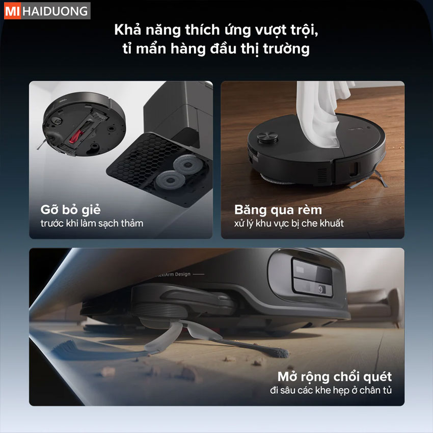 Một trong những hạn chế thường gặp của robot hút bụi là khó tiếp cận các khu vực sát tường hoặc góc hẹp. Với Roborock Q Revo Edge 2, công nghệ FlexiArm đã giải quyết triệt để vấn đề này, giúp nâng cao hiệu quả làm sạch toàn diện. FlexiArm cho phép chổi hoặc cụm lau linh hoạt mở rộng khi cần thiết, tiếp cận sâu hơn vào các mép tường, chân bàn ghế và những khu vực khó chạm tới. Nhờ đó, bụi bẩn không còn bị bỏ sót ở các vị trí “khó nhằn” – nơi mà các robot thông thường thường bỏ qua. Không chỉ tăng độ phủ làm sạch, công nghệ này còn hoạt động thông minh theo từng tình huống thực tế, đảm bảo robot vừa làm sạch hiệu quả vừa di chuyển mượt mà, không va chạm hay mắc kẹt. Kết quả là không gian sống được làm sạch đồng đều hơn, kể cả ở những chi tiết nhỏ nhất, mang lại trải nghiệm tiện nghi và hoàn thiện hơn cho người dùng.