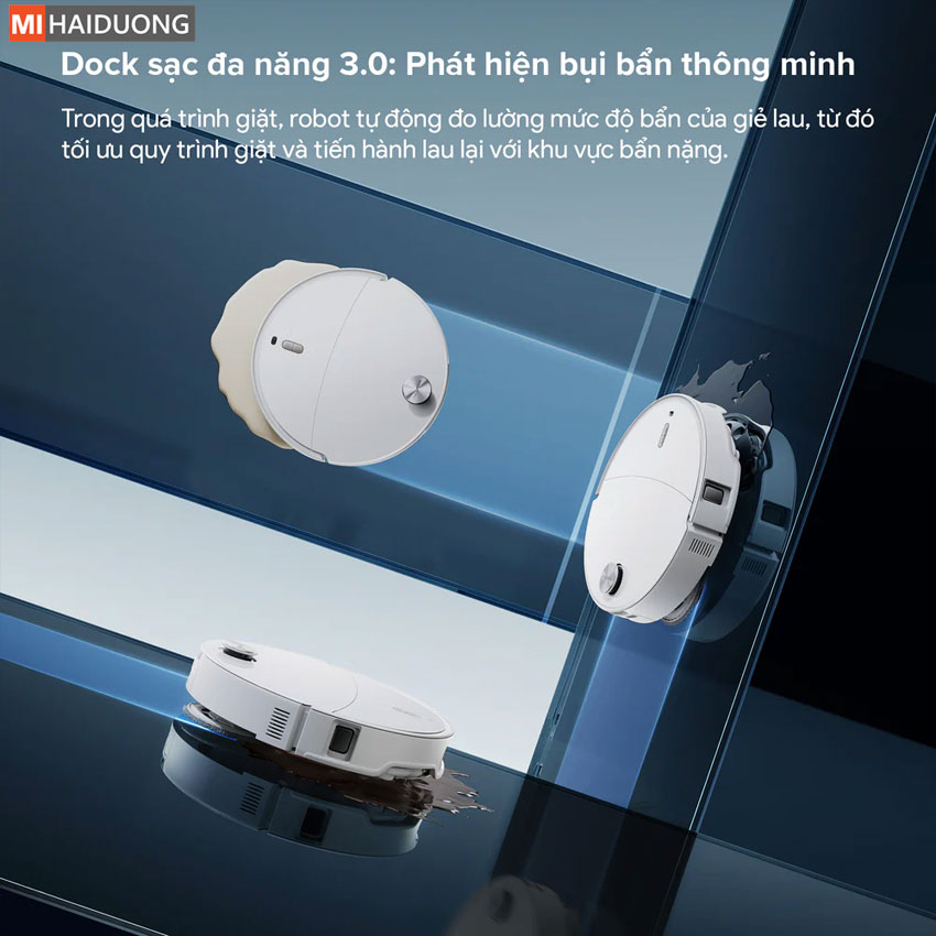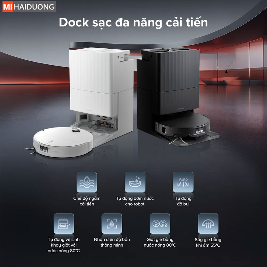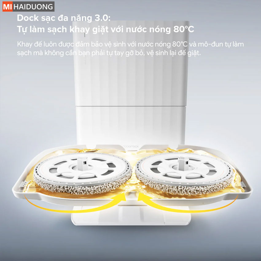 Trạm sạc All-in-One tiên tiến: Giặt giẻ lau và làm sạch khay giặt bằng nước nóng 80°C, sấy khô bằng khí nóng 55°C.