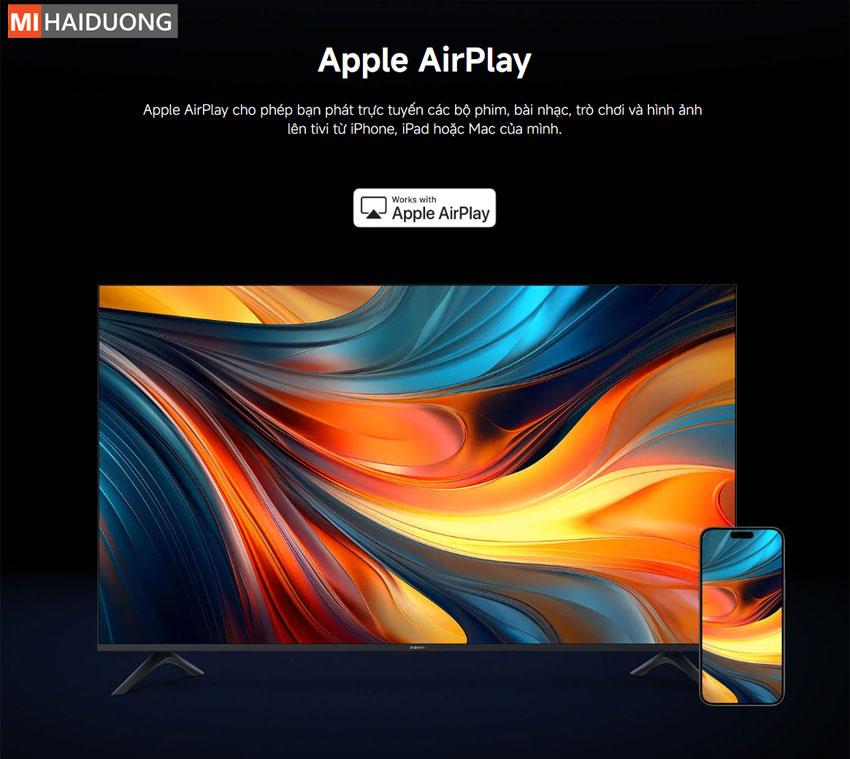Với tính năng Google Cast và Apple AirPlay tích hợp sẵn, Tivi Xiaomi 43 inch A Google TV 2026 cho phép bạn dễ dàng truyền tải phim ảnh, chương trình yêu thích, trò chơi, nhạc và cả hình ảnh từ điện thoại thông minh, máy tính bảng hoặc máy tính cá nhân lên màn hình TV chỉ trong vài thao tác.