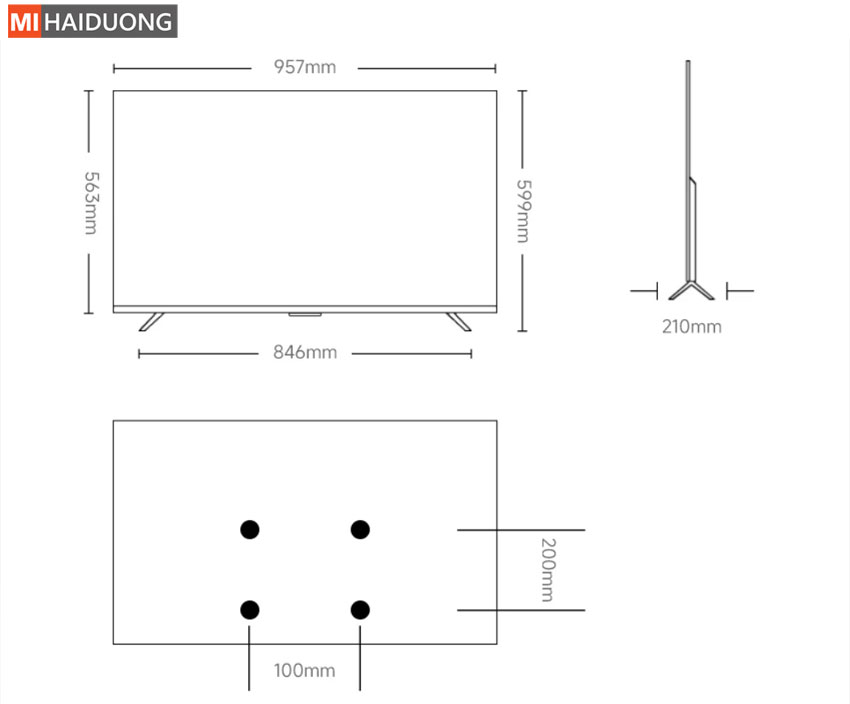 | Thiết kế và lắp đặt | Kích thước tivi | Kích thước có chân đế: 957 x 211 x 599mm Kích thước không có chân đế: 957 x 72 x 563mm |