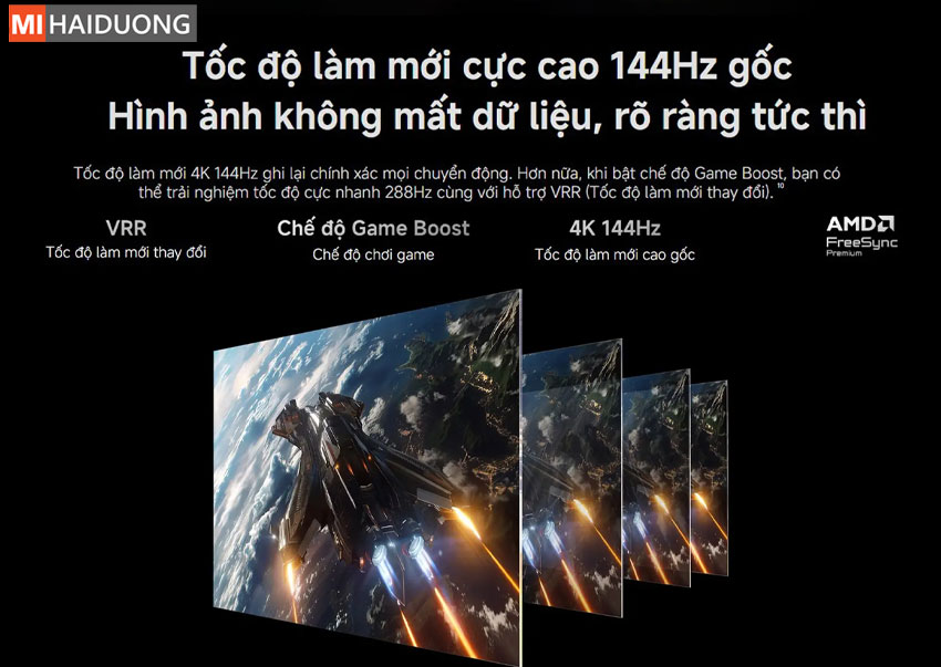 Xiaomi Smart Display S Mini LED 98 2026 sở hữu tần số quét gốc lên đến 144Hz, mang lại khả năng hiển thị mượt mà, sắc nét trong mọi chuyển động nhanh. Dù là xem thể thao, phim hành động hay chơi game, hình ảnh luôn rõ ràng, hạn chế tối đa hiện tượng giật lag hay nhòe hình. Khi kích hoạt chế độ Game Boost, TV có thể nâng tần số quét lên đến 288Hz, kết hợp công nghệ VRR (Variable Refresh Rate) giúp đồng bộ khung hình, giảm xé hình và tối ưu trải nghiệm chơi game. Ngoài ra, sự hỗ trợ của AMD FreeSync Premium giúp đảm bảo hình ảnh ổn định, phản hồi nhanh, mang đến trải nghiệm giải trí và gaming mượt mà, liền mạch và đầy sống động.