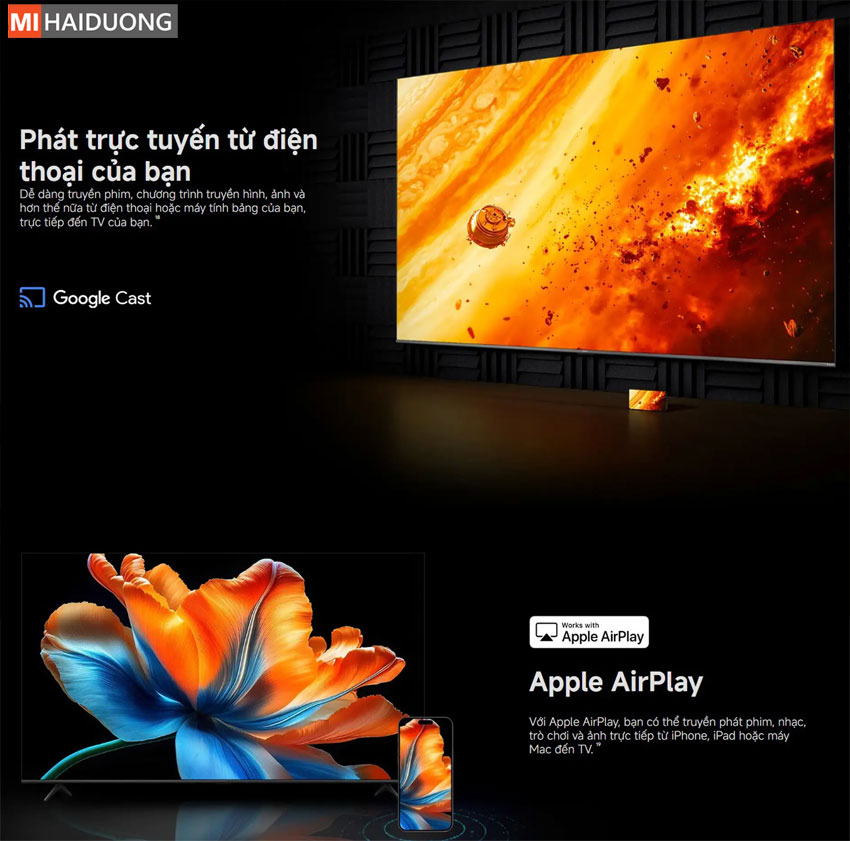 Xiaomi Smart Display S Mini LED 98 2026 hỗ trợ cả Google Cast và Apple AirPlay, cho phép người dùng dễ dàng trình chiếu nội dung từ điện thoại, máy tính bảng hoặc laptop lên màn hình lớn mà không cần dây cáp. Người dùng Android có thể sử dụng Google Cast để chia sẻ nhanh chóng các nội dung như phim, hình ảnh hay ứng dụng, trong khi người dùng iPhone, iPad và Mac có thể kết nối trực tiếp qua AirPlay một cách mượt mà, không cần cài đặt thêm.