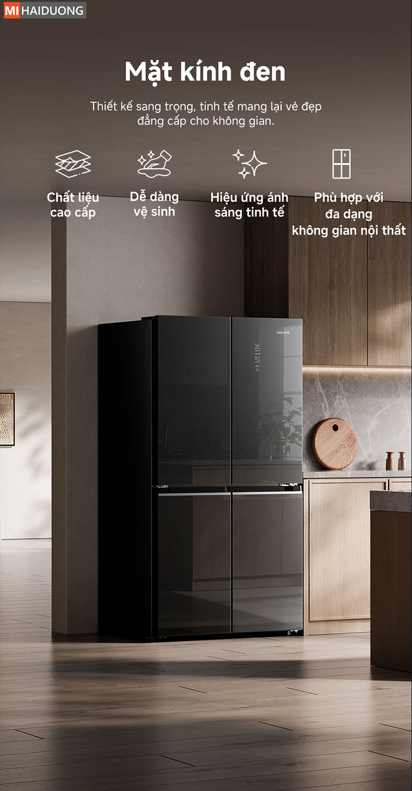 | Thiết kế | Mặt kính đen cao cấp, kiểu dáng 4 cửa |