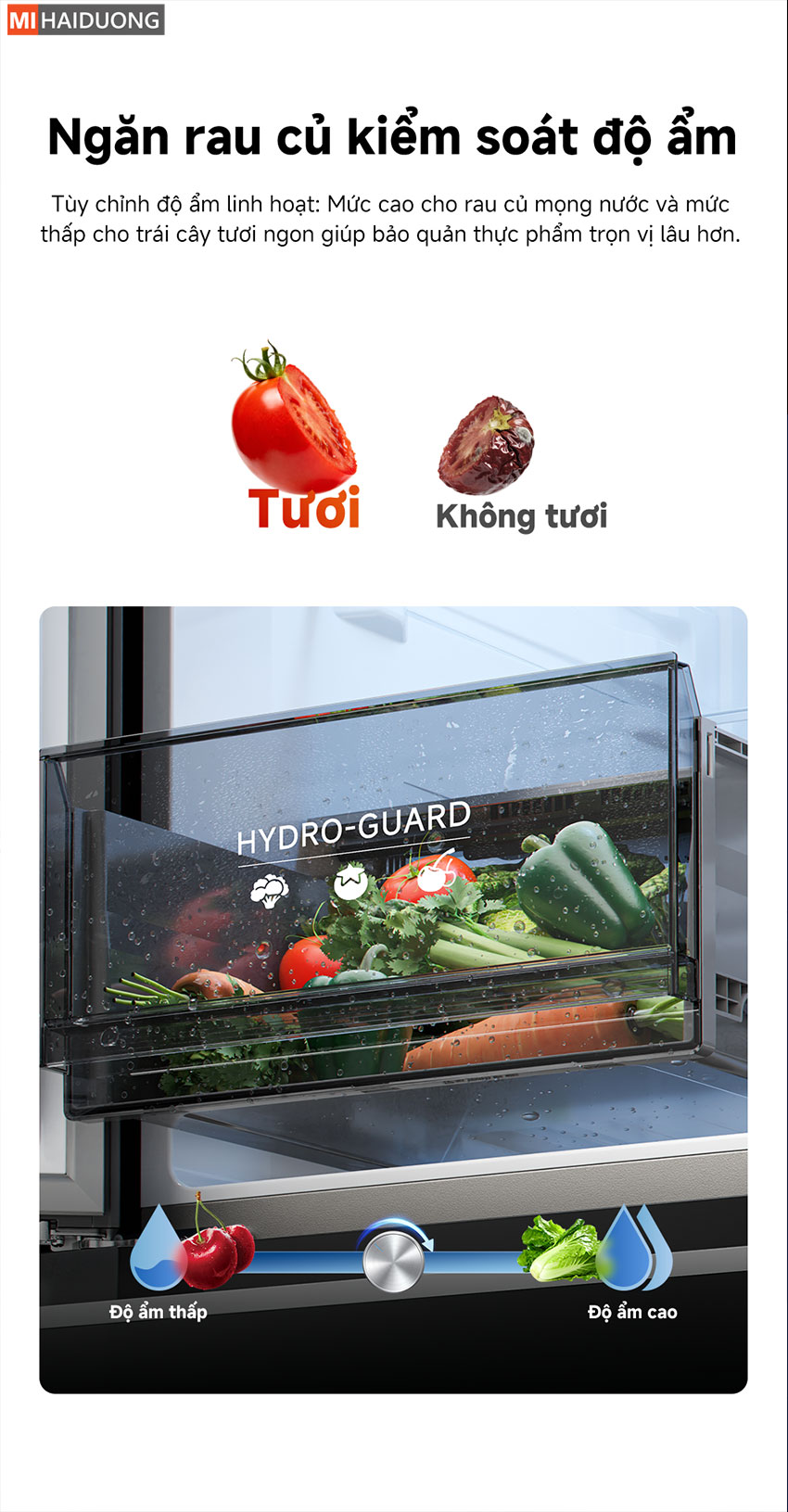 Ngăn rau củ kiểm soát độ ẩm Hydro-Guard với khả năng tùy chỉnh linh hoạt, cho phép thiết lập độ ẩm cao để giữ rau xanh mọng nước, tươi lâu và độ ẩm thấp để bảo quản trái cây khô ráo, hạn chế úng hỏng, từ đó giúp duy trì độ tươi ngon, giữ trọn hương vị và dưỡng chất của thực phẩm trong thời gian dài.