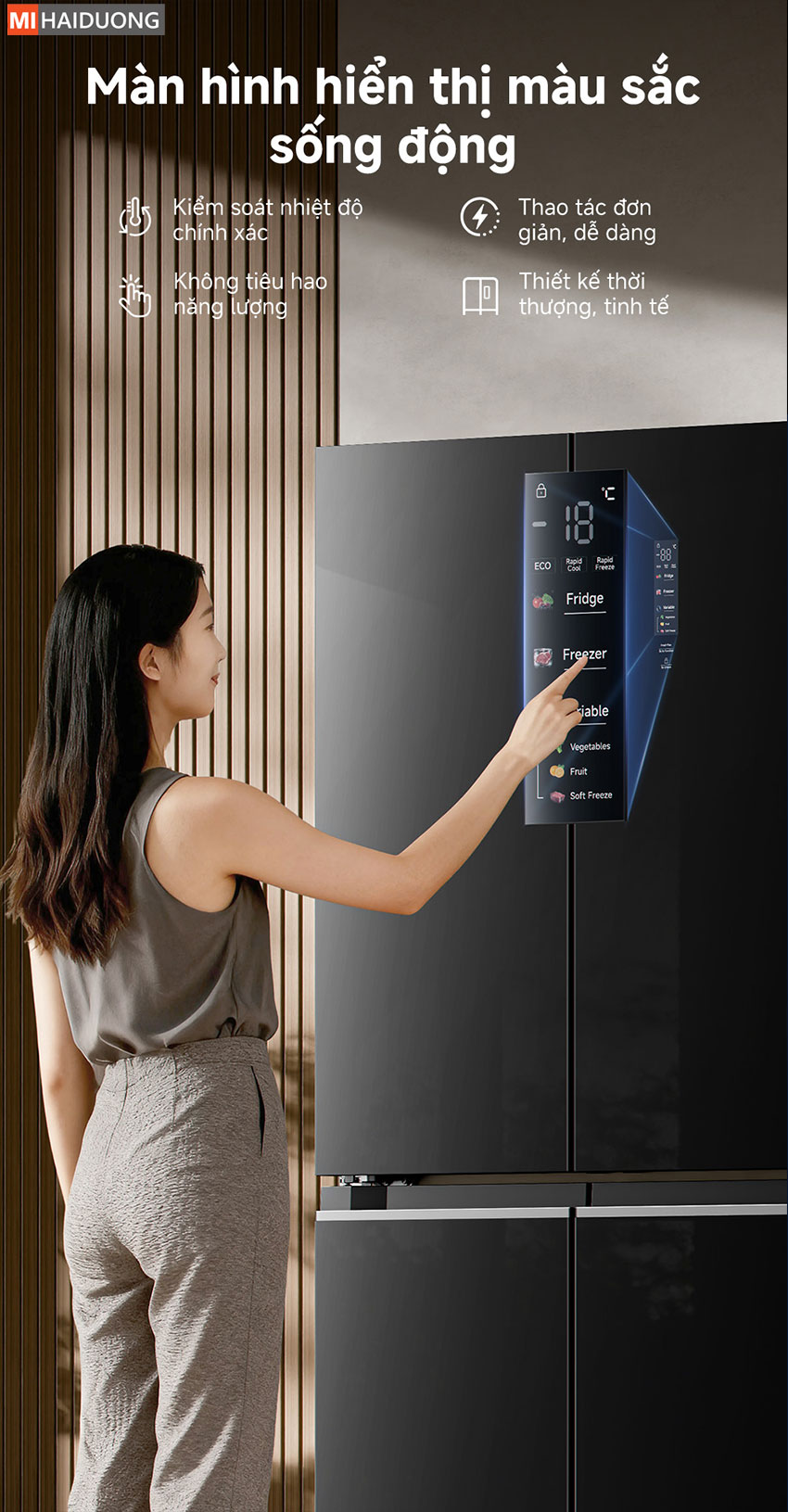 Trên mặt trước của tủ, Dreame Inverter 600 lít tích hợp màn hình cảm ứng được ẩn liền mạch vào thiết kế, không làm phá vỡ sự liền khối của mặt kính. Màn hình này cho phép người dùng theo dõi và điều chỉnh nhiệt độ từng ngăn riêng biệt, bật hoặc tắt các chức năng đặc biệt như chế độ đông nhanh, chế độ tiết kiệm điện hay thay đổi mức nhiệt ngăn FreshFlex – tất cả chỉ bằng một vài thao tác chạm. Giao diện trực quan giúp việc thiết lập thông số trở nên đơn giản ngay cả với người dùng lần đầu tiếp xúc với dòng sản phẩm này.