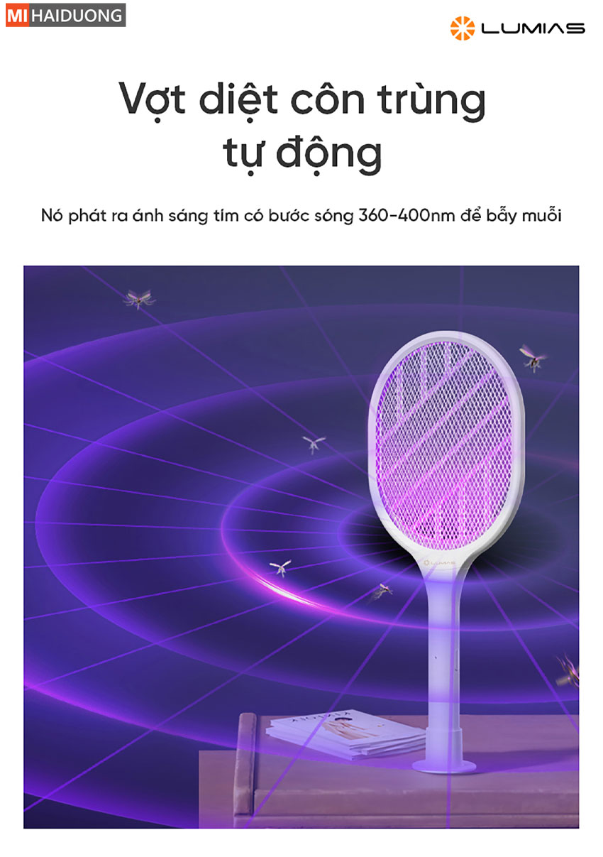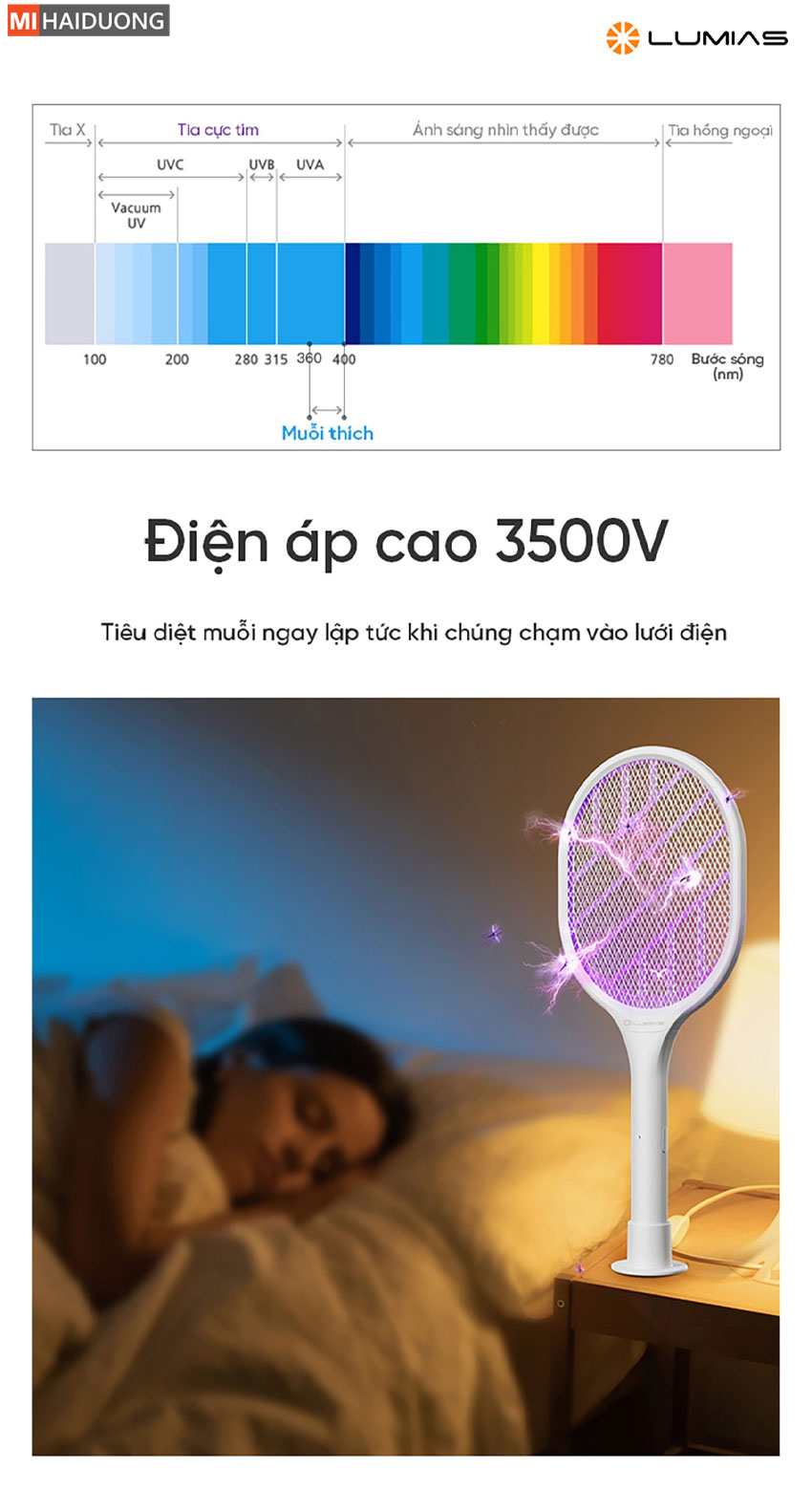 Vợt muỗi Lumias ESD-3500W ứng dụng đèn LED UV bước sóng 395-400nm thu hút muỗi và côn trùng từ khoảng cách 40m, đồng thời hoạt động như đèn ngủ dịu nhẹ. Sản phẩm được thiết kế cho hai chế độ sử dụng thông minh: